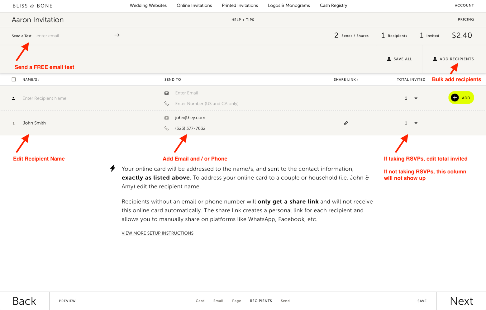 TO SUMMARIZE: If you want to address an email with a Household name like "John, Amy & Family", then you simply need to edit and type that in on your recipient list. This is exactly how it would work if you were sending printed wedding invitations!