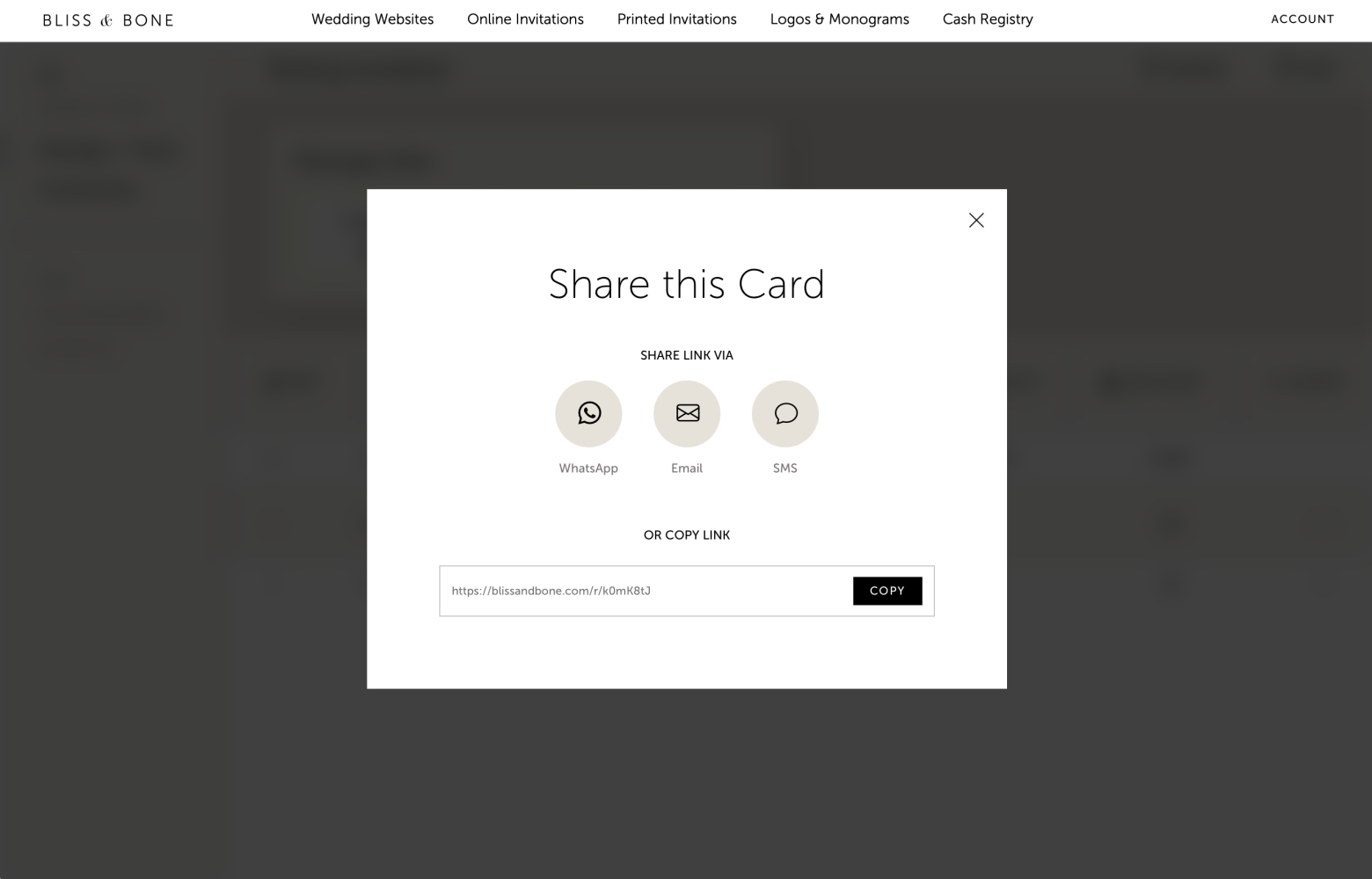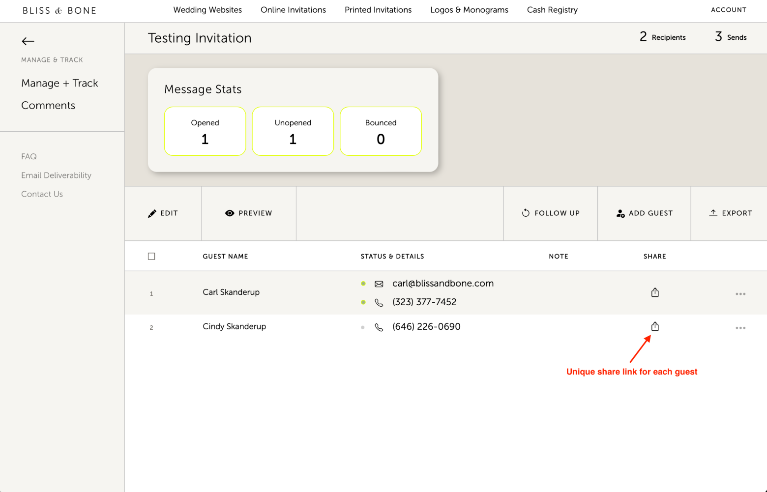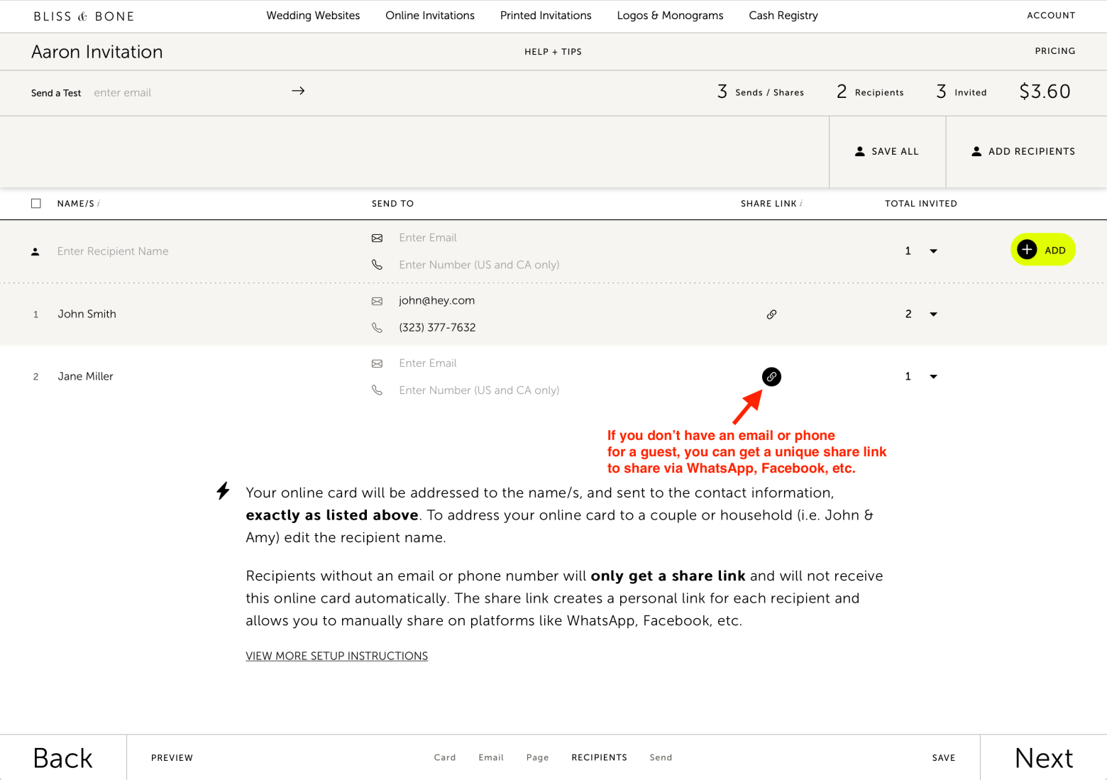 If you don't have an email or phone number for a guest, or you'd like to share with an international guest via WhatsApp, you can still add them to your recipient list and get a unique share link. Once you pay for that unique share link, it will be availabe in your "manage & track" to manually share with your guest(s). See the screenshots below!