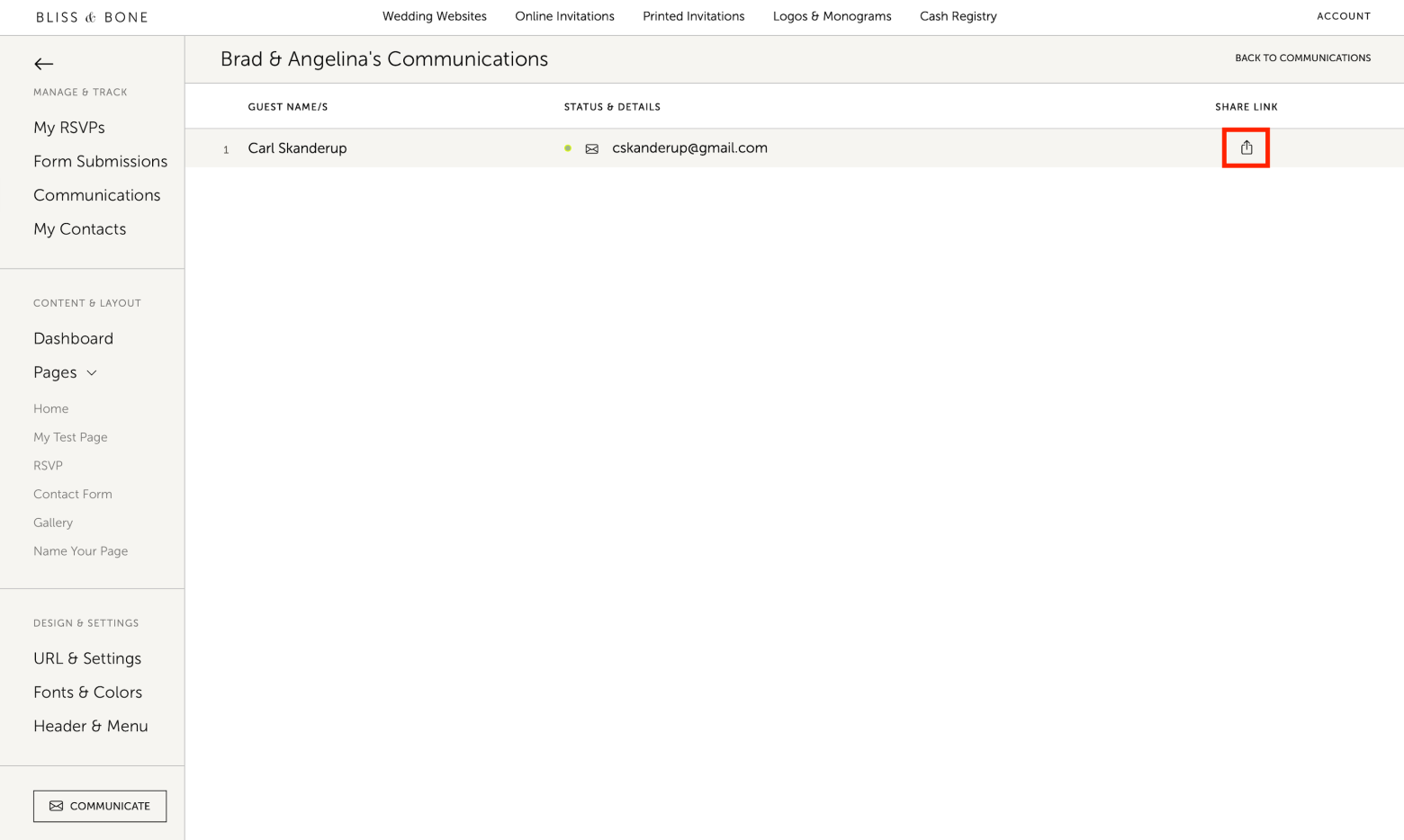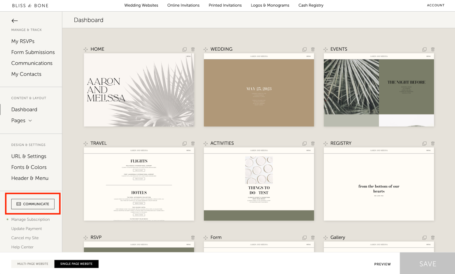 With a Premium website membership you can email or text your guests as much as you want for free! To craft and send a communication, click on the Communicate button in your Website Editor.