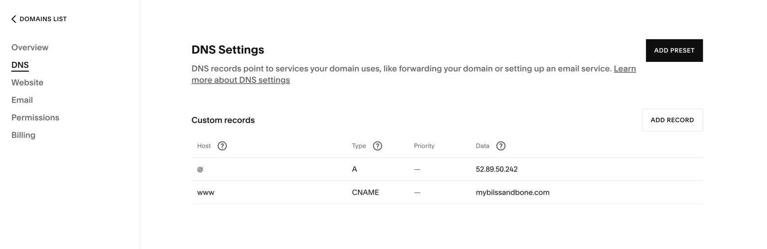 If you get an error in red, that typically means that your DNS settings aren't quite right. If just can't figure it out, email us at hello@blissandbone.com and we can help! It's always best to email in a screenshot of your DNS settings, and then we can troubleshoot with you!