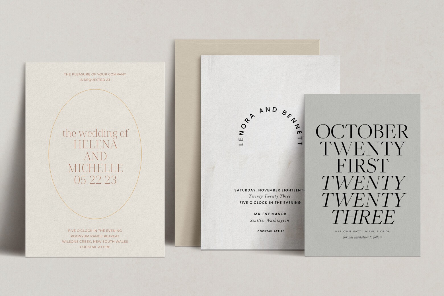 Absolutely. While most couples stick with a typical wedding invitation size like A7, you can work with a stationer or designer to create a custom size. Maybe you want an oversized A9 card for extra drama, or a small 4-Bar card for a minimalist look. Custom wedding invitation sizes allow you to tailor the proportions to your design — just remember that unusual sizes may require custom envelopes and extra postage.
